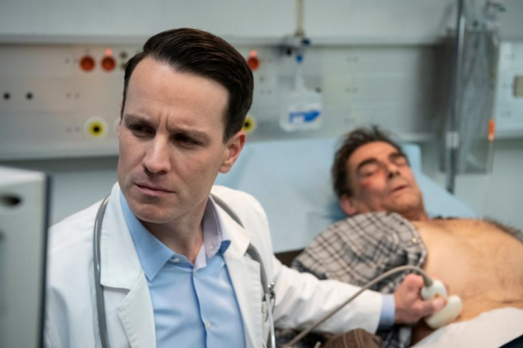 Dr. Jan Kühnert (Marc Dumitru, l.) untersucht den Vater (Martin Feifel) von Leonie an der Leber, als ihm etwas sehr gefährliches auffällt.