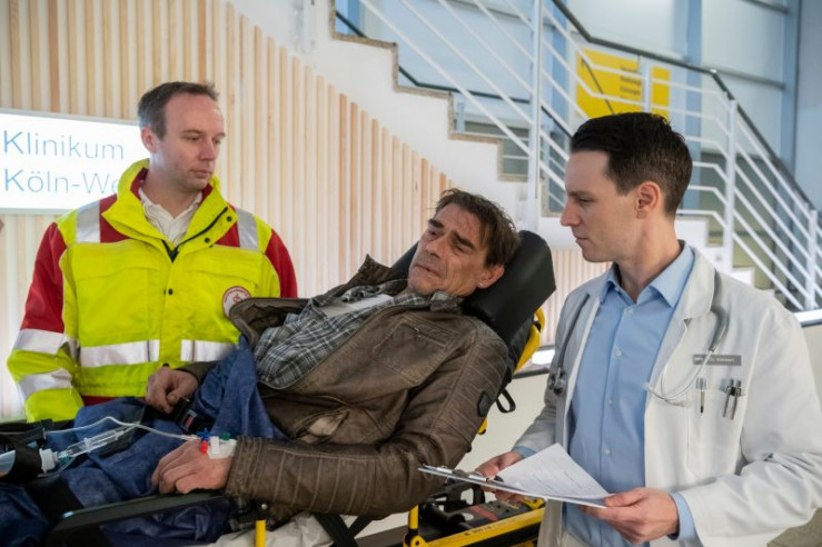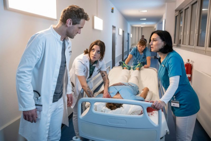 Ella (Ines Quermann, 3.v.l.) wurde von einem Patienten brutal angegriffen und lebensgefährlich verletzt. Dr. Sebastian Sander (Oliver Franck), Dr. Leonie Mertens Leonie (Linda Marlen Runge, 2.v.l.) und Nora (Mimi Fiedler, r.) bereiten alles für einen Notfall-Einsatz vor.