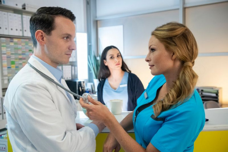 Samira (Sila Sahin-Radlinger, M.) beobachtet wie Nadine (Jana Schölermann, r.) abermals versucht, Dr. Jan Kühnert (Marc Dumitru) um den Finger zu wickeln.