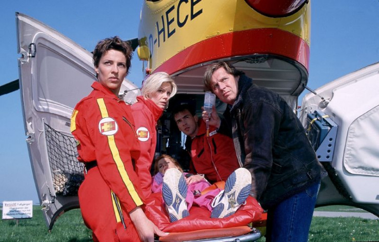 Pilotin Biggi (Sabine Petzl, li.), Notärztin Gabriele (Anja Freese, 2.v.li.), Sanitäter Ralf (Wolfgang Krewe) und Dr. Stefan Frank (Sigmar Solbach, re.) tragen Irene Kadenbach (Claudia Wenzel) in den Medicopter. +++ Die Verwendung des sendungsbezogenen Materials ist nur mit dem Hinweis und Verlinkung auf RTL+ gestattet. +++
