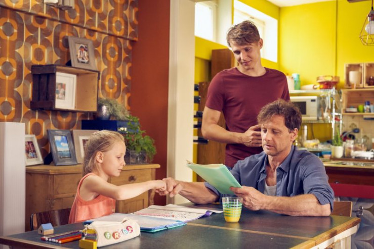 Stefan (Hendrik Duryn, r.) und Jonas (Merlin Rose) schauen sich gemeinsam Fridas (Leni Säugling) Bild an.