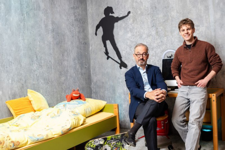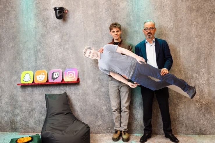 Levi Penell (l.) und Jan Fleischhauer (r.) halten einen Pappaufsteller von Mark Zuckerberg - Social-Media-Inszenierung mit Augenzwinkern.