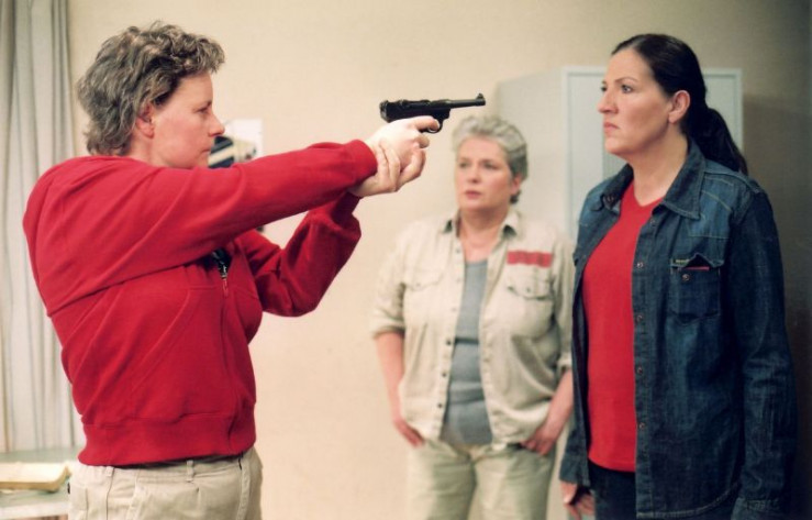 Melanie (Sigrid M. Schnückel, li.) bedroht Walter (Katy Karrenbauer, re.), weil sie glaubt, dass Walter die Waffen vernichtet hat. (hi. Barbara Freier) +++ Die Verwendung des sendungsbezogenen Materials ist nur mit dem Hinweis und Verlinkung auf RTL+ gestattet. +++
