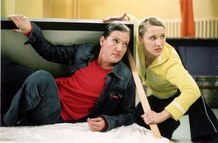 Melanie (Sigrid M. Schnückel, li.) bedroht Walter (Katy Karrenbauer, re.), weil sie glaubt, dass Walter die Waffen vernichtet hat. (hi. Barbara Freier) +++ Die Verwendung des sendungsbezogenen Materials ist nur mit dem Hinweis und Verlinkung auf RTL+ gestattet. +++