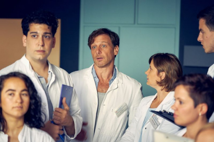 Stefan (Hendrik Duryn, Mi.) hat sich unter die jungen Assistenzärzte (David Daria und Kristina Peters) gemischt.